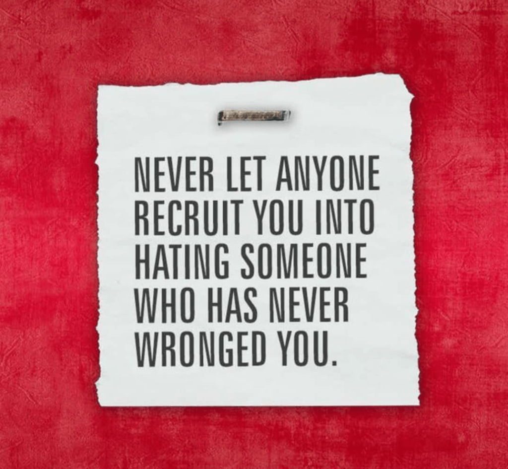 To get conned into allowing oneself into being recruited into hating someone who has never wronged you is a mistake we’ve all made. Don’t fall for it!
