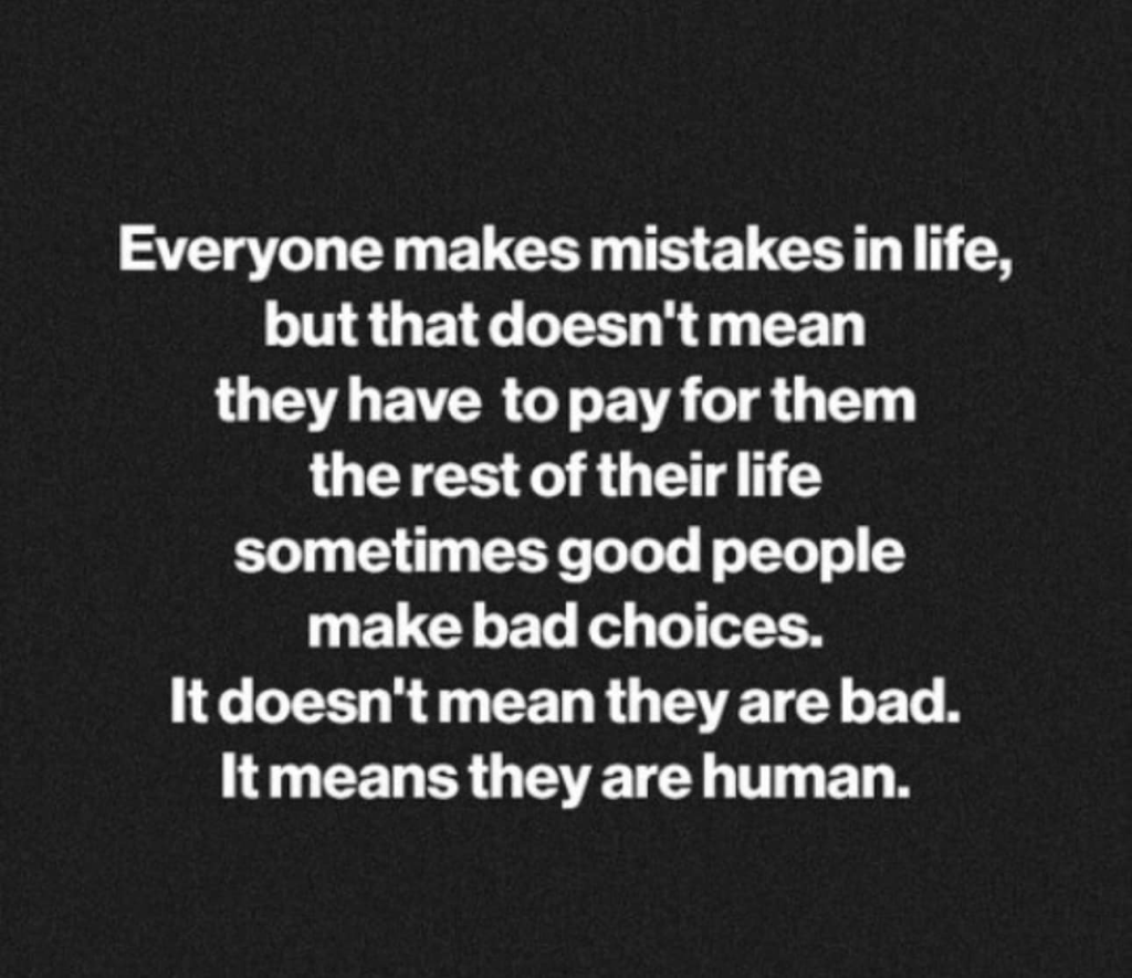 I’ve seen this meme shared on social media from time to time and each time I see it, it really strikes me. I’ve made some pretty hefty mistakes in my life. If it hadn’t been for the very patient people/animals I’ve managed to surround myself with, my life could have taken a drastically different direction. Thank goodness for those who get that we are human, and not all bad.